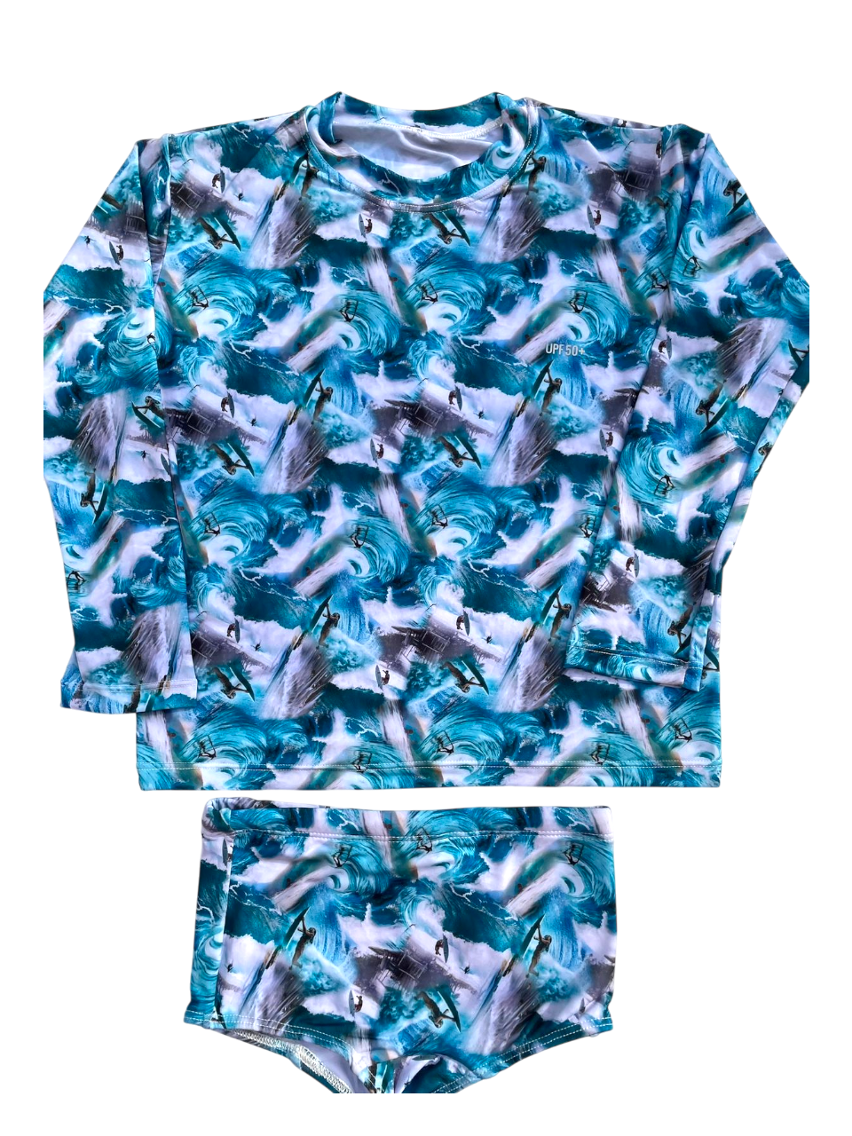 Perfeito para os pequenos exploradores aquáticos, este conjunto une a diversão da estampa de Surf em tons de azul com a proteção essencial contra o sol. Ideal para dias de praia, piscina ou qualquer aventura ao ar livre, garantindo que a diversão seja segura e estilosa.