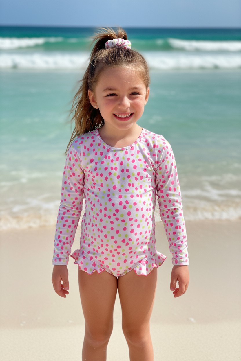 O maiô infantil de manga longa estampa de Poá colorido da Bella Vie é a escolha perfeita para unir charme e praticidade.