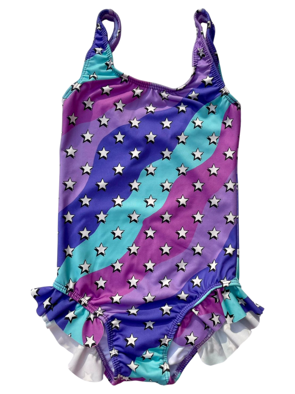 O maiô infantil possui babado nas pernas e não possui fechamento.
