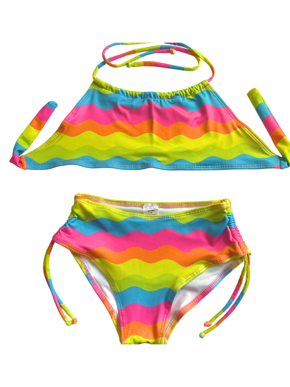 O conjunto é composto por um Top com fechamento de amarrar  e calcinha mais alta na cintura estilo sunquini.